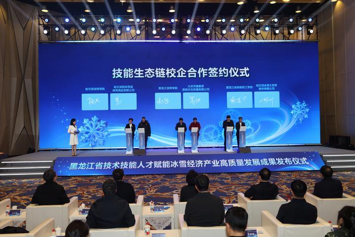 黑龙江省技术技能人才赋能冰雪经济产业高质量发展成果发布仪式上举行的技能生态链校企合作签约仪式。(受访者供图)