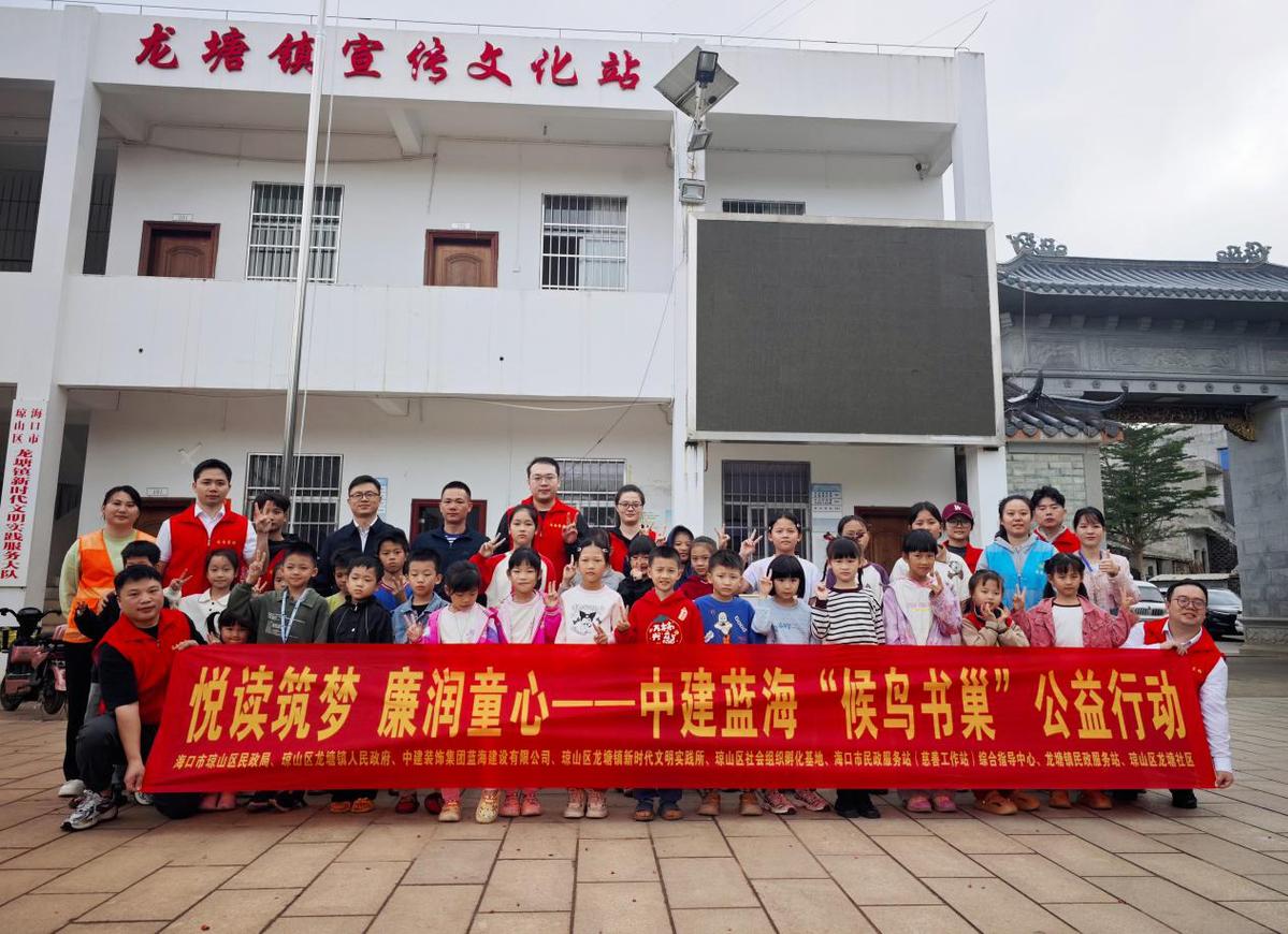 | 12月20日上午,海口市龙塘镇文彩村文化广场暖意融融,中建装饰集团蓝海建设有限公司携手海口市龙塘镇人民政府、琼山区社会组织孵化基地等单位,共同开展以“悦读筑梦 廉润童心”为主题的“候鸟书巢”公益活动,通过赠书阅读、趣味互动、廉洁启蒙等丰富形式,为当地儿童送上精神滋养与成长力量。