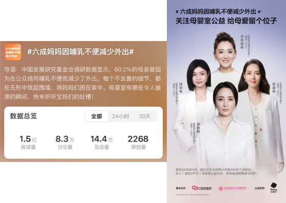 10月16日,#六成妈妈因哺乳不便减少外出#话题冲上热搜,引发社会热议,截至发稿,阅读量破1.5亿。知名演员蒋勤勤、郭碧婷、陈妍希,以及央视著名主持人月亮姐姐等众多明星联合《中国慈善家》杂志、浙江省妇女儿童基金会以及母婴头部品牌 Babycare共同发声呼吁:“关注母婴室公益、给母爱留个位子”。此外,多位奥运冠军、行业专家等社会知名人士都参与发声。