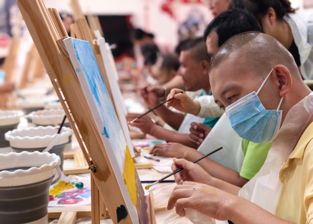 活动聚焦残疾人文化需求,精心设计了多元化的体验内容。在非遗制作板块,大漆扇绘制、团扇装饰、景泰蓝、掐丝珐琅创作、扭扭棒手工、传统簪花制作等项目依次开展,非遗传承人结合残疾人的操作特点,简化制作流程、提供细致指导,让不同能力的参与者都能亲手完成非遗作品,感受传统工艺的独特魅力;同时,传统书法临摹、油画创作等艺术体验环节同步推进,为热爱书画的残疾人搭建了展示与交流的平台,帮助他们在笔墨与色彩中释放情感、提升自信。
