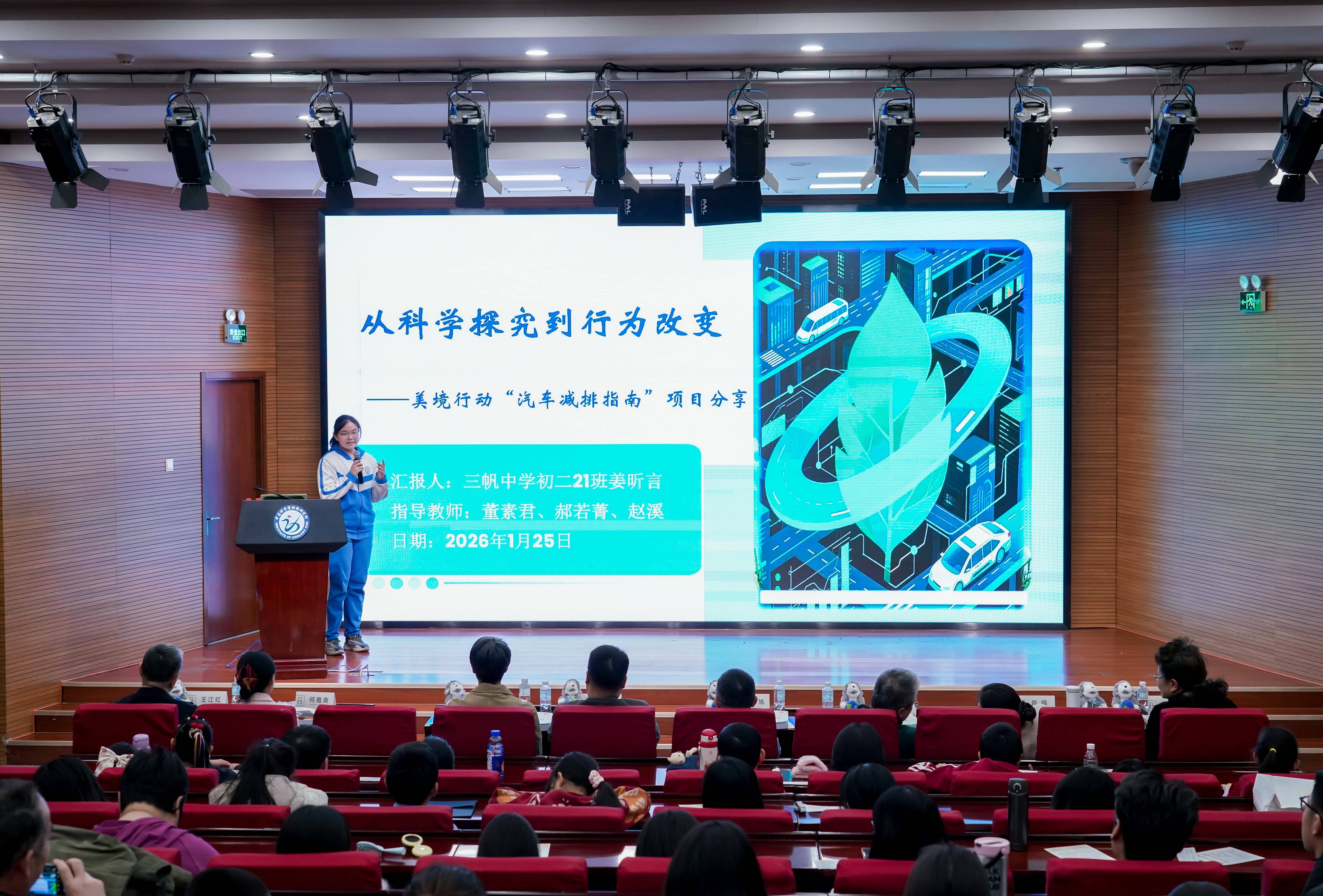 在经验分享环节,来自北京市昌平第二实验小学、北京市朝阳区青少年活动中心以及北京市三帆中学的三组优秀学生代表依次登台。他们分别围绕校园节水装置改造、闲置物品循环利用以及低碳出行方式研究等主题,分享了各自从发现问题到提出解决方案,再到动手实施的全过程。虽然项目切口不同,但都展现了当代青少年运用科学知识解决实际环境问题的能力与担当。
